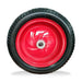 Red coloured, with a baked enamel finish, 1 piece pressed steel core centred with unique high strength ribbs and quality flange style ball bearing fitted rim. Flat free rubber tyre.