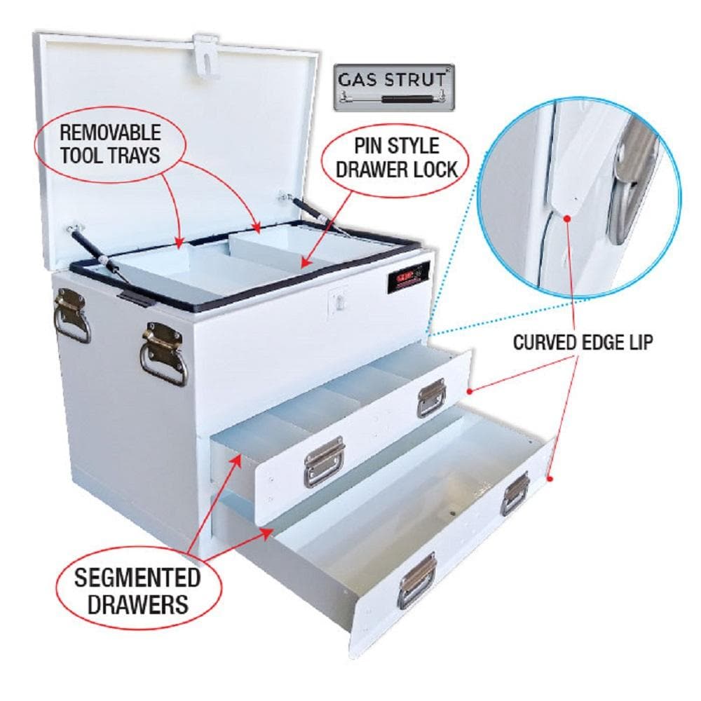 Exclusively designed to handle harsh conditions when fitted to utes, table top trays, vans and trailers. Manufactured from heavy gauge steel with fully welded joints and powder coated finish. Drawers are full width with heavy duty slide guides and uniquely designed drawer fronts with “curved edge lip” technology.