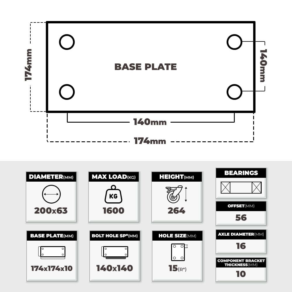 Grip 41966 200mm 1600kg Heavy Duty Cast Iron Swivel Castor
