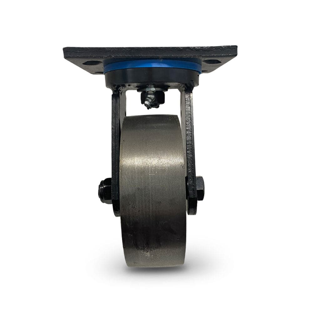 EXTREME HEAVY DUTY fabricated steel componentry with black zinc finish for corrosion resistance. Full cast iron, double ball bearing core centered wheel. Suitable for use on automotive assembly lines, aviation trolleys and in production manufacturing plants.