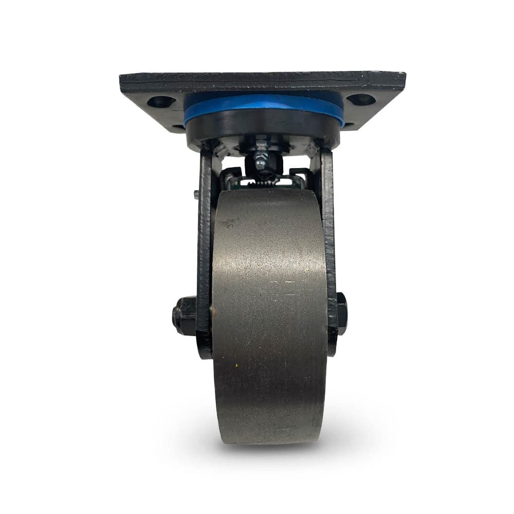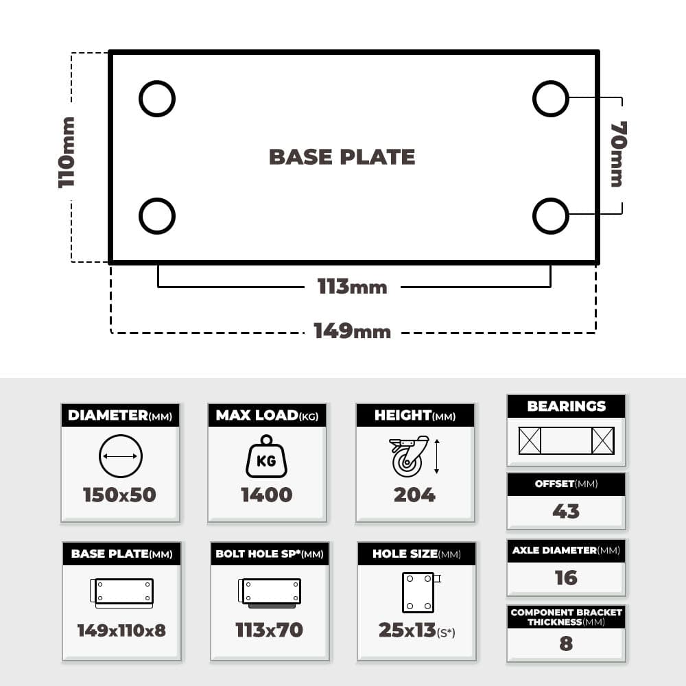 EXTREME HEAVY DUTY fabricated steel componentry with black zinc finish for corrosion resistance. Full cast iron, double ball bearing core centered wheel. Suitable for use on automotive assembly lines, aviation trolleys and in production manufacturing plants.