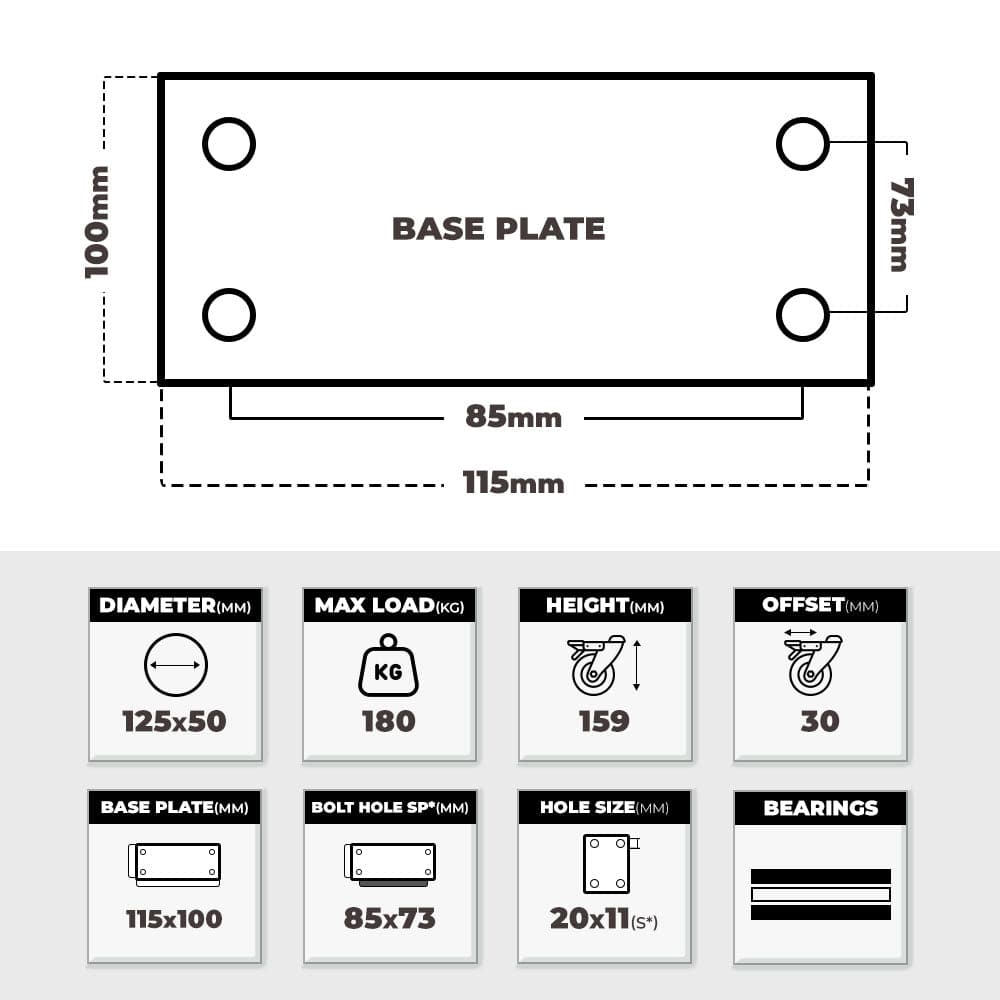 Heavy duty gal plated fabricated steel componentry with cast iron, greased core, roller bearing centred wheel with moulded rubber outer. For internal or external general purpose heavy industrial applications.