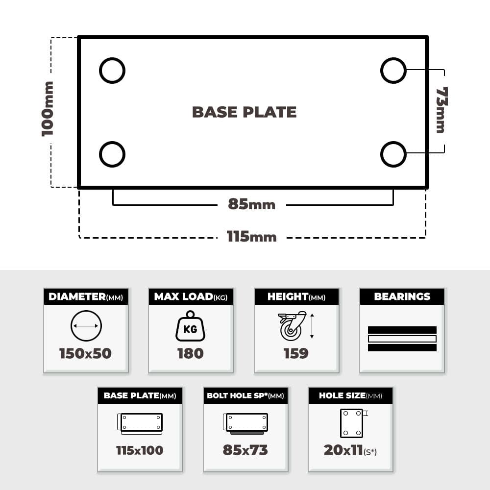 Heavy duty gal plated fabricated steel componentry with cast iron, greased core, roller bearing centred wheel with moulded rubber outer. For internal or external general purpose heavy industrial applications.