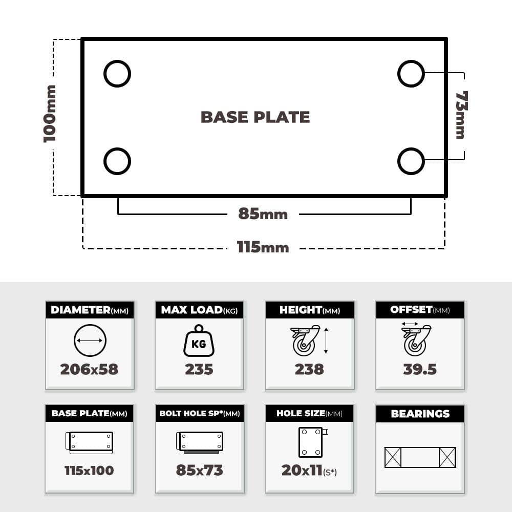 Grip 42090 206mm 235kg Rubber Wheel Steel Core Swivel Castor