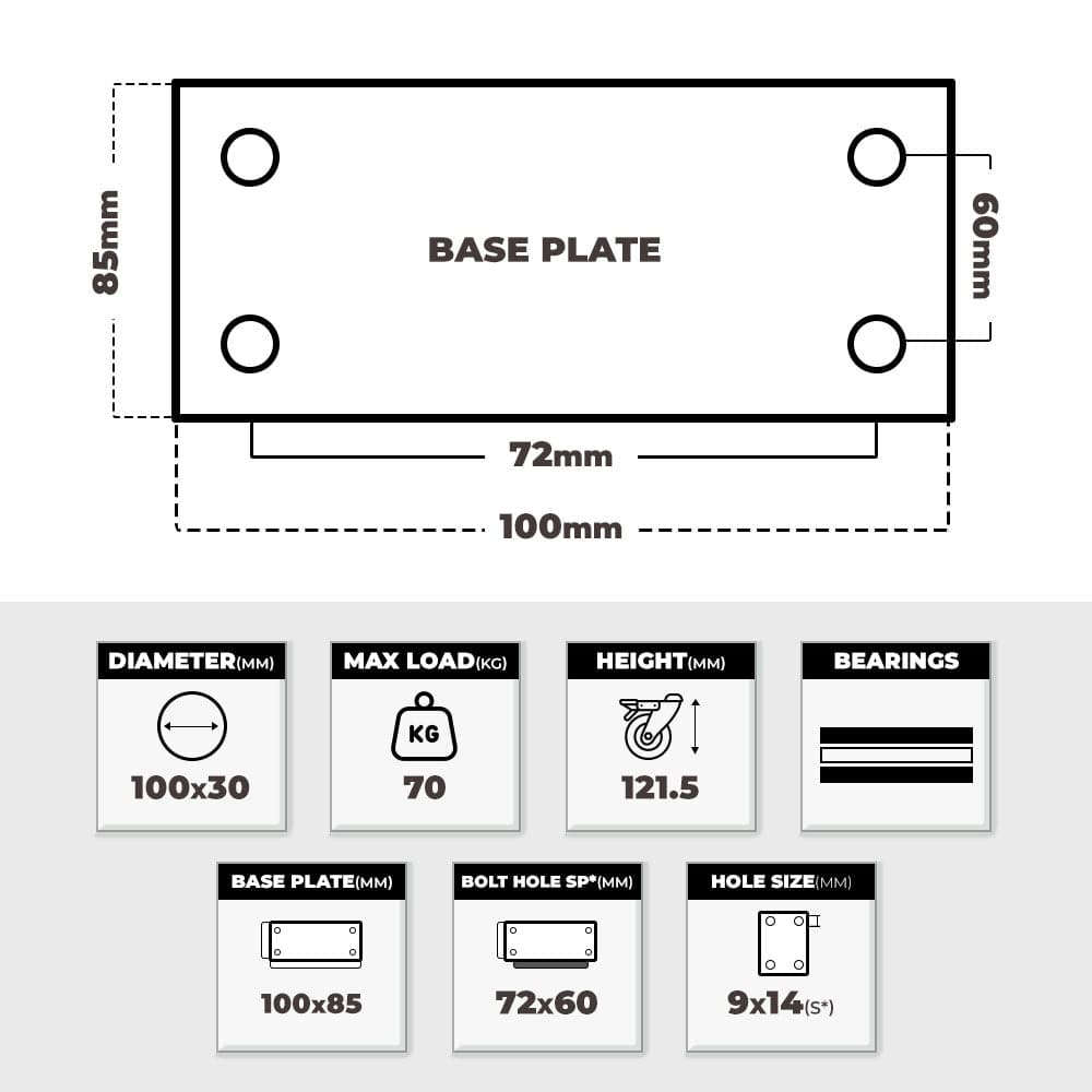 Grip 43024 100mm 70kg Rubber Moulded Steel Core Fixed Castor