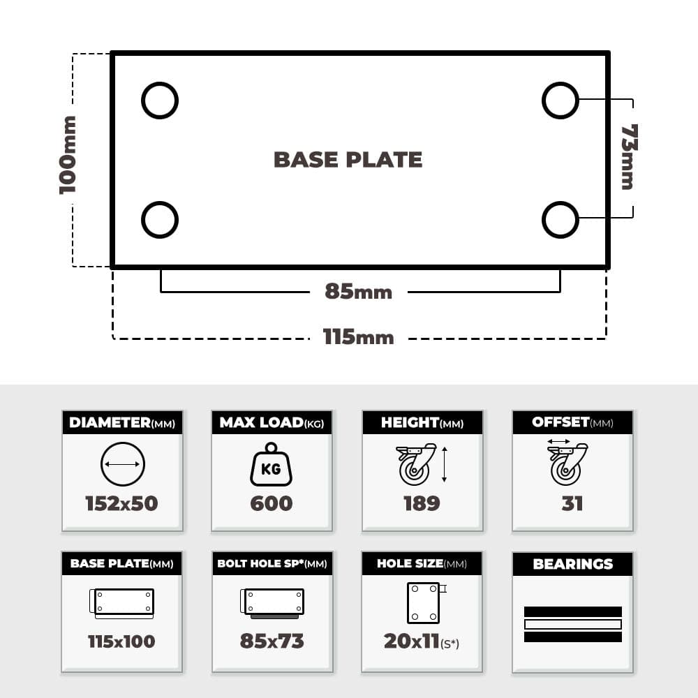 Grip 43032 152mm 600kg Industrial Heavy Duty Cast Iron Swivel Castor